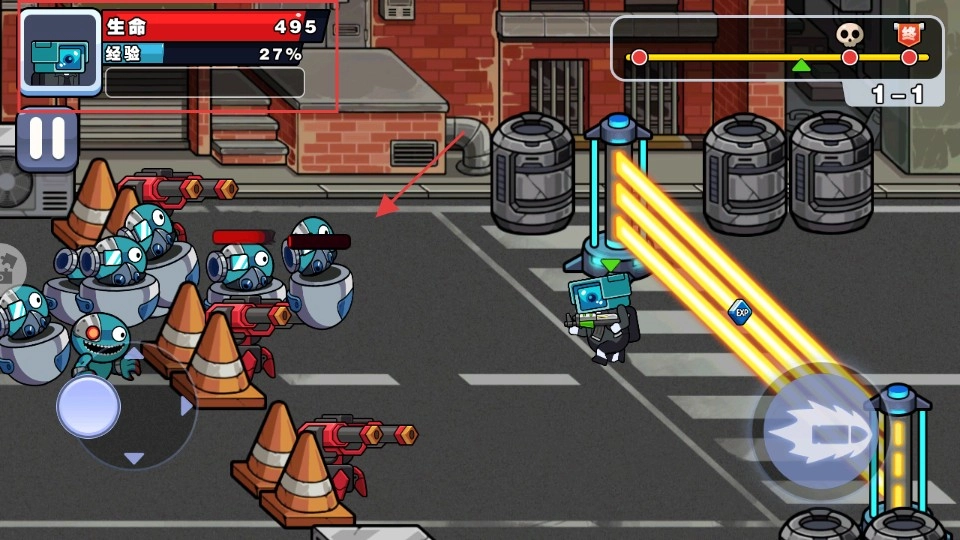4、战斗中关注【生命】(如【495】)与【经验】(如【27%】),走位躲多敌,积累经验变强。