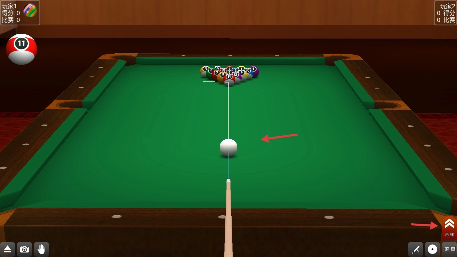 2、开球时,调整球杆对准球堆,拉动球杆控制力度,点击【击球】,让白球冲散球阵,开启精彩战局哦。