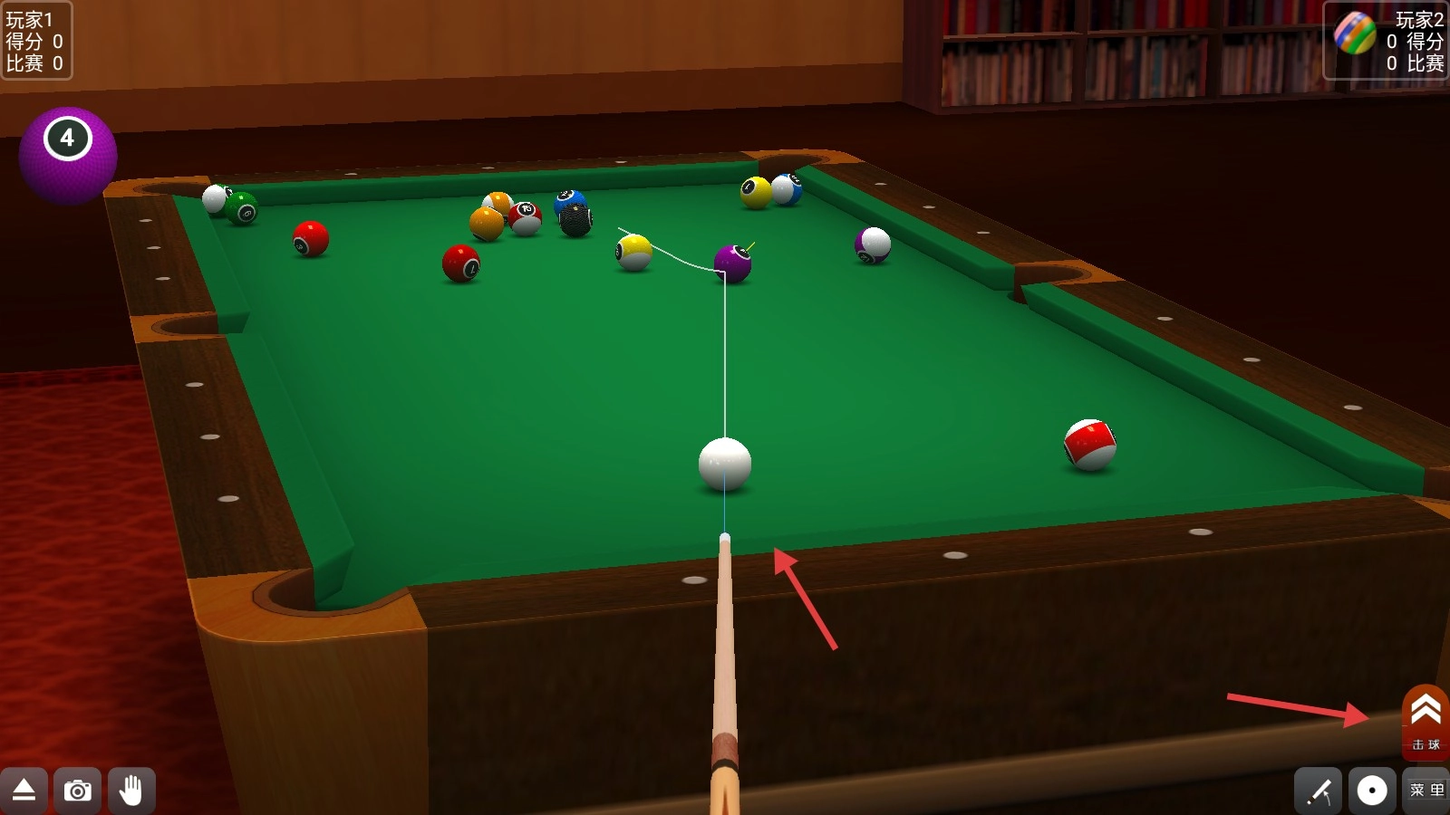 3、游戏过程中,瞄准作为目标的紫色4号球,调整球杆方向与力度线,精准点击击球,助力目标球入袋得分呢。