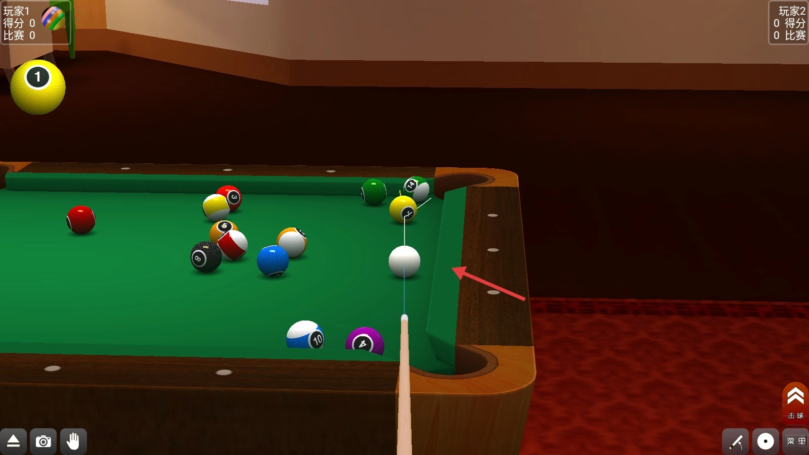 操作时,向后拉杆一定距离,会出现一条代表力和方向的线条。球杆与击球点之间的距离代表着力,同时击球角度和击球点也可以调整。