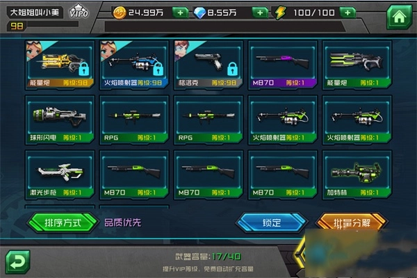 背包界面可以查看当前已获得的武器和宠物,便于进行合成与批量分解操作。(狸猫酱我玩到现在,才合出一把金色武器……各位土豪大大尽管鄙视我吧_(:3 」∠)_)