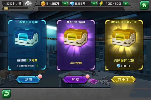 这里支持用金币和钻石兑换不同品质的补给箱,箱内有机会开出顶级武器装备,追求高端体验的玩家可别错过。即便不是重度氪金玩家,也建议定期登录查看,系统会定时发放免费开箱次数,要是错过了可就亏大了!