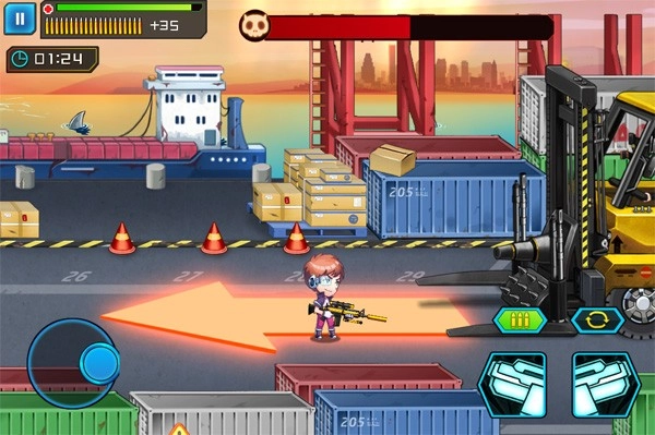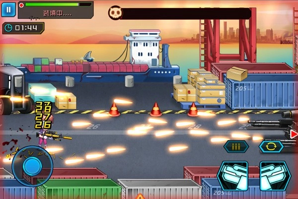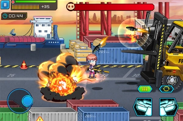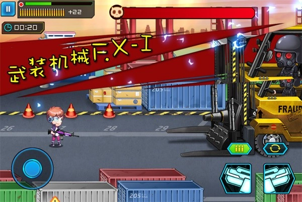 boss驾驶的战车,原型是一架重型叉车改装而成,而操控这辆战车的人,看着是不是有些眼熟?没错,他就是我们之前遇到过的蒙面男M.A.S.K。boss刚出场时,并没有驾驶战车,攻击方式也和之前的boss完全一样。小伙伴们可别被他骗了,这不过是正餐前的开胃小菜罢了。三下五除二熟练解决掉戴面具的M.A.S.K.后,他退到了屏幕边缘,紧接着钢铁巨兽就登场了!