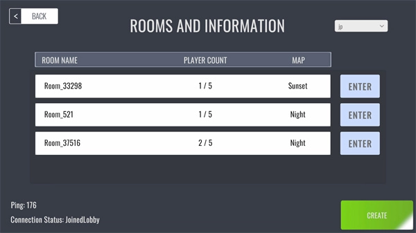 3、进入后,可以看大很多的在线房间,选择右下角的CREATE,也就是创建。