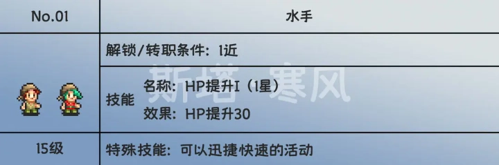 1、水手:后勤类职业,其特技为行动迅捷快速。凭借移动速度快的优势,能够高效地处理各类杂务,是实用性很强的工具人角色,值得推荐。