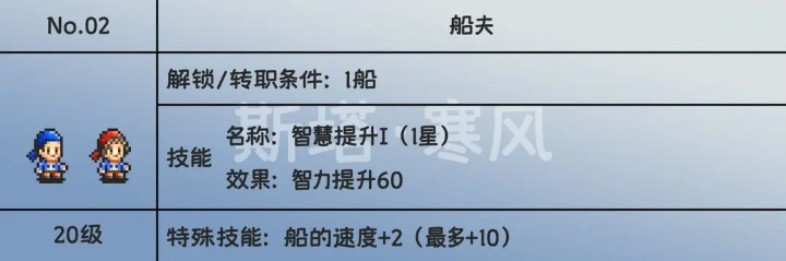 2、船夫:后勤类职业,其特技可使船只速度提升2点(此效果上限为10点)。船只速度的重要性不言而喻,这里便不再展开说明。建议招募5名船夫,且无需安排他们上阵作战。