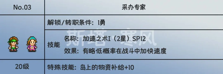 3、采办专家:后勤类职业,能让岛上的物资补给增加10点。大家都知道,物资补给受智力的影响最大,随便穿一件加智力的装备,提升的效果都远不止10点;而且要是想升级建筑,选择开店相关的职业效率会更高。所以这个职业不太推荐。