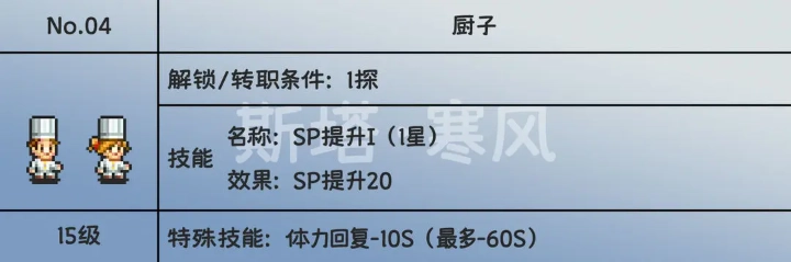 4、厨师属于后勤类职业,其特技是体力恢复时间减少10秒(最多可减少60秒)。这个技能要是搭配黄金会员使用,就能达到一分钟恢复一点体力的效果,所以前期基本上不用操心体力不够的问题。建议招募6个厨师,而且不需要让他们上阵作战。在国王据点的某一关boss处,有一个仅需1个牌子就能兑换的厨师,除此之外其他渠道的厨师都比较贵。推荐大家在酒馆F等级时,用2个牌子来招募厨师。