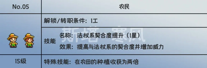 5、农民:后勤类职业,特技为农田种植收获翻倍(植物厂收获同样翻倍)。该特性可通过转职获取,例如能由水手转职为农民,在保留水手特殊技能的前提下,额外获得农民的特殊技能。此职业对挂海档而言是必需品,后续刷副本时岛上缺乏活力补给也能派上用场。其缺点是种田需要消耗G,但所需数量不多。