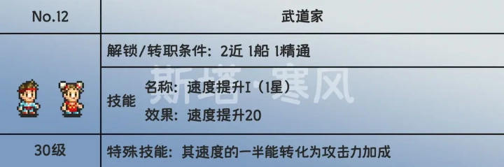 7、武道家:战斗职业,特技是把速度转化为攻击力,表面上看似乎还不错,但实际用起来也是个废物。没什么实用价值的战斗职业,直接跳过。