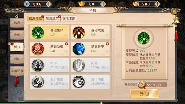 使用个人贡献点,升级帮派技能,附加属性大增