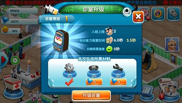 如果体力药水用完了也没关系,我们可以让劳累的医生进入休息室来补充体力,初期休息室内只能同一时间容纳两个人,如果想容纳更多的人,就需要升级休息室喽。级别越高的休息室容纳人数越多。但是切忌还是不要让所有的医生同时劳累比较好,要不然就没有人给患者看病喽!