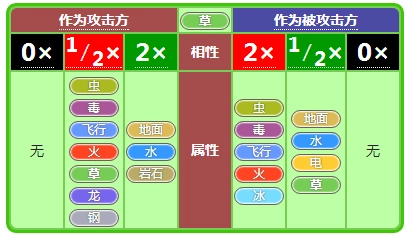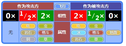 的属性克制关系为:克制地面、水、岩石三种属性;自身存在弱点,会被虫、毒、飞行、火、冰属性克制;同时能抵抗地面、水、电、草属性的攻击。