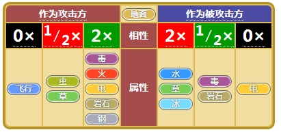 地面系克毒、火、电、岩石、钢,弱点水、草、冰,抵抗毒、岩石,无视电