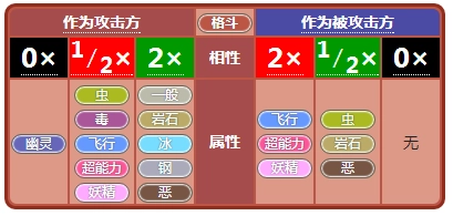 幽灵系克制超能力和幽灵系,它的弱点是幽灵和恶系,抵抗虫系与毒系,并且对一般系和格斗系的攻击免疫。