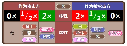 恶系克制超能力与幽灵系,弱点为虫、格斗和妖精系,抵抗幽灵及恶系,并且对超能力系的攻击免疫。