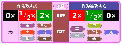 妖精系克制格斗、龙、恶这三个属性,自身的弱点是毒和钢属性,同时能抵抗虫、格斗、恶属性的攻击,并且对龙属性的攻击完全免疫。