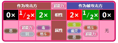 虫系克草、超能力、恶,弱点飞行、火、岩石,抵抗地面、格斗、草