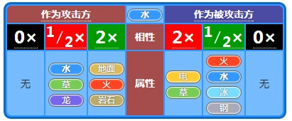 水系的克制属性为地面、火、岩石,弱点属性是电、草,抵抗属性包括火、水、冰、钢。