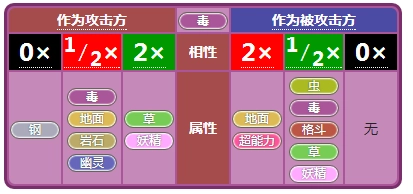 毒系克制草系与妖精系,在属性上的弱点是地面系和超能力系,同时能够抵抗虫系、毒系、格斗系、草系以及妖精系的攻击。