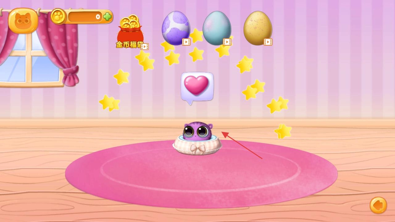 蛋孵化后会出现紫色的宠物,这时你可以和宠物互动,满足它的需求,像之后要进行的喂食等操作,就能帮助宠物成长。