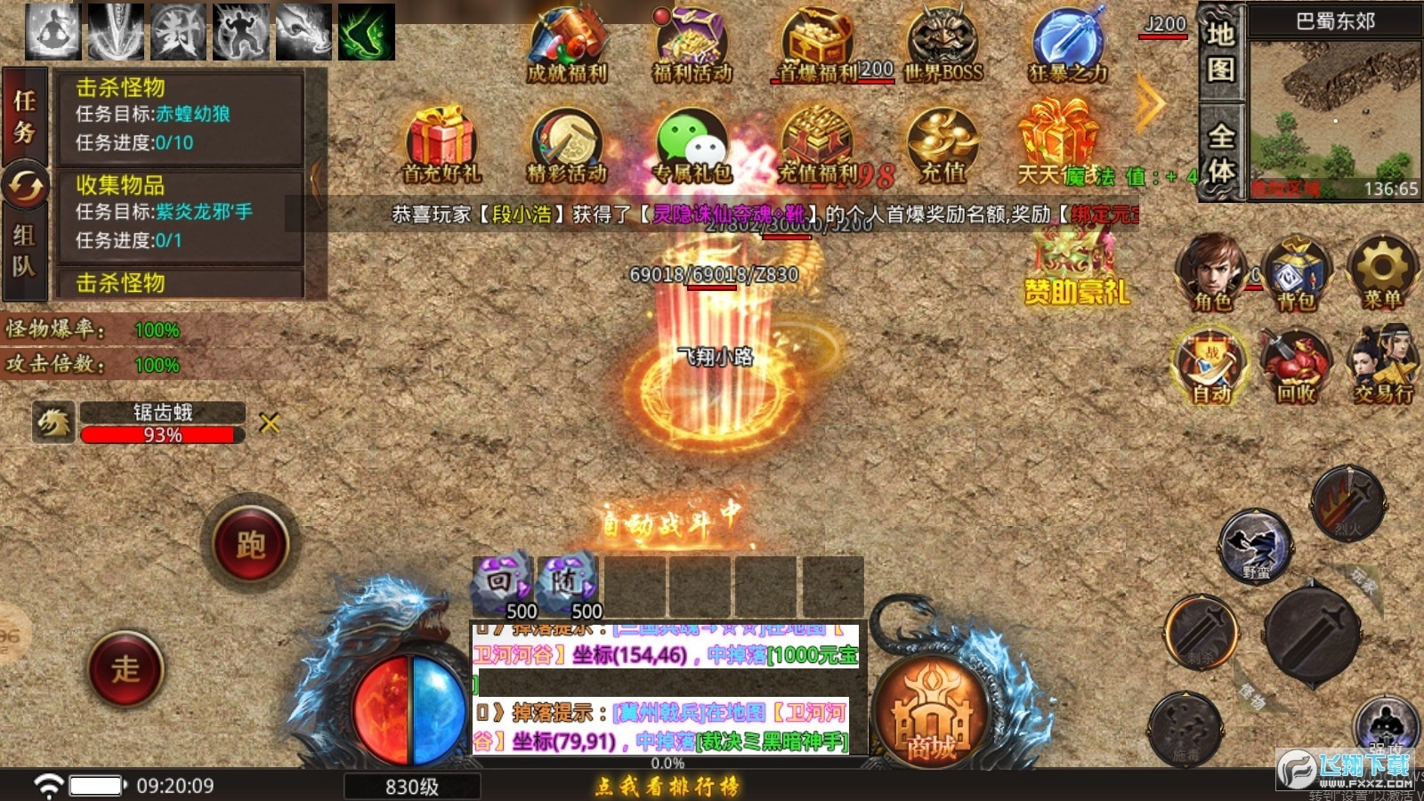 轻松挂机快速升级,可设置自动闯关,挑战BOSS时满地掉落极品装备。