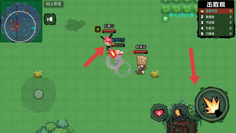 落地之后,控制角色进行移动,当碰到其他玩家时,点击攻击按钮,与他们展开战斗,尽力击败对手,成功存活下来。