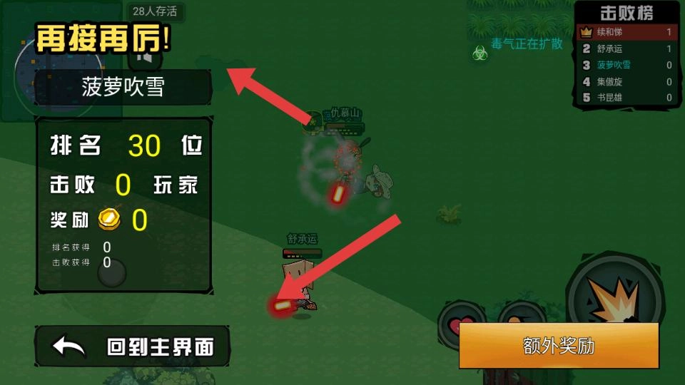 角色被击败后,屏幕会显示“再接再厉”的提示,同时展示排名、击败玩家数等数据,玩家可选择返回主界面或领取额外奖励。