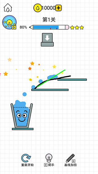 进入关卡后,只需通过拖动来画线,就能把水引入水杯了。