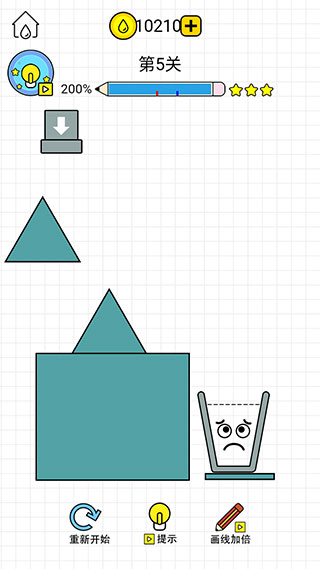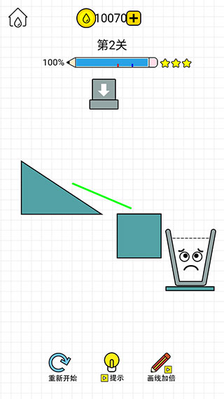 游戏的通关目标十分简单,玩家只需拖动屏幕画线,将水引入水杯即可。只要水杯中的水达到虚线位置,就能获得关卡胜利。不过需要注意的是,游戏中画线的长度有限制,每画一点,铅笔的长度就会减少一点。如果把铅笔的长度全部用完,水才恰好达到虚线位置,虽然也能过关,但会严重影响过关评分。因此,玩家在游戏中还需要思考怎样画最短的线来实现过关。
