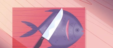 使用刀处理鱼肉,准备好做菜的一系列食材