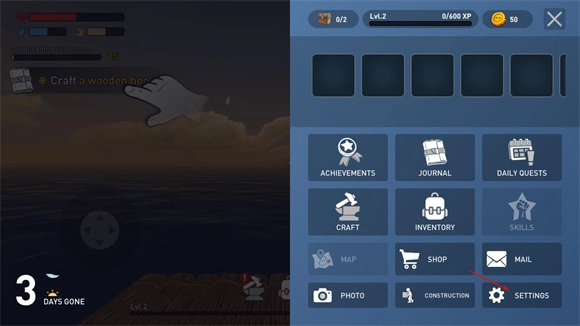 采集物资有两种途径,一种是徒手采集,这种方法仅能获取木筏周边的物资;另一种则是借助木钩,来收集周围漂流的资源。
