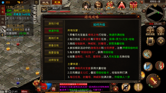 前往【封魔塔】能快速升级,在这里可以打出所有装备,收取玩家打满的【月光宝盒】还能获得大量经验。