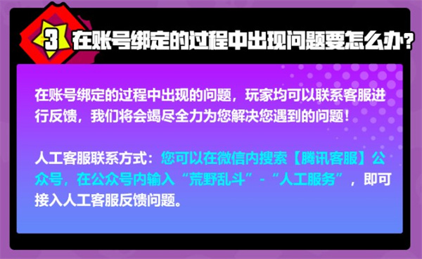 在账号绑定过程中遇到任何问题,玩家都可以联系客服反馈,我们会竭尽全力为您解决!人工客服的联系方式如下:您可以在微信里搜索【腾讯客服】公众号,进入公众号后依次输入“荒野乱斗”和“人工服务”,就能接入人工客服反馈您的问题啦。