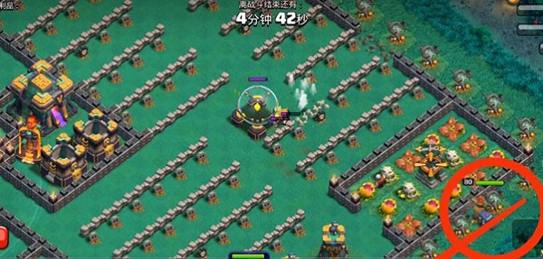 在女王拆除炸弹塔的过程中,在下方的红色方框区域部署南瓜头野蛮人,数量控制在10个左右即可,以此吸引x弩的仇恨。这样做能够进一步确保女王和女武神保持良好的状态。