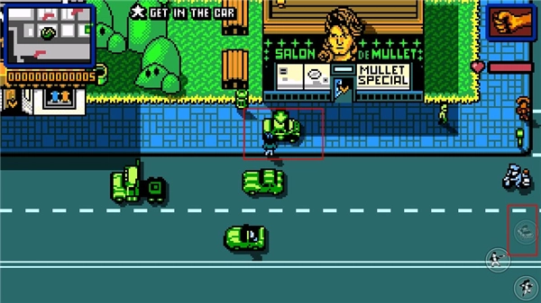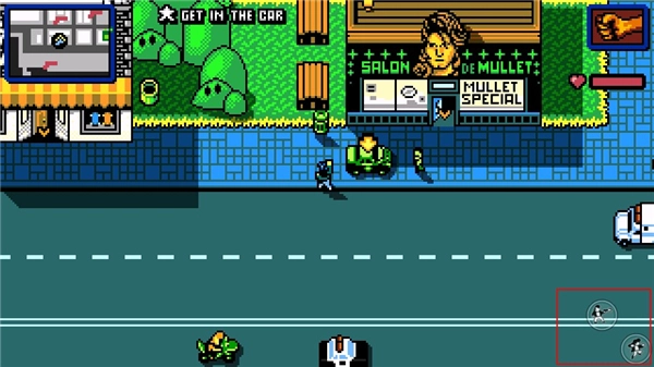 操作同样十分容易上手,采用左侧虚拟摇杆、右侧“攻击”“跳跃”“上车”三大按键的常见设计。“攻击”效果会随角色当前武器状态变化:手持枪炮时为射击,使用棍棒时是挥舞打击,若未持武器则变为赤手空拳的搏击。“跳跃”技能能帮助翻越各类障碍物,实际体验显示主角弹跳力超过2米——比如他可以跳到任何人头上将其踩倒并搜刮金钱,这一设定极似《超级马里奥》的风格。