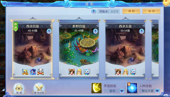 游戏内设有5个挂机地图,分别是西凉、新野、萧关、白狼山与濡须,玩家也可选择在当前位置挂机。此外,在地图中挂机时,还有一定概率捕捉到灵宠。