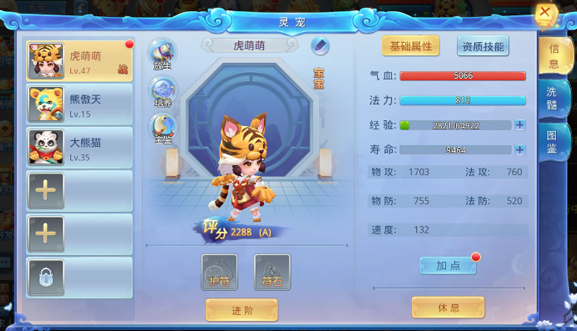 在游戏里,当人物角色达到3级且完成主线任务后,灵宠系统便会解锁,同时玩家能得到系统免费赠送的首个灵宠。灵宠具备物攻资质、物防资质、气血资质、法力资质和速度资质这5项基础资质,另外还有独特的成长属性。灵宠各项基础资质的优劣,决定了它后续的发展方向,玩家可以依据灵宠的基础资质情况,分别为其体质、力量、智力、敏捷和耐力这五类属性分配点数。