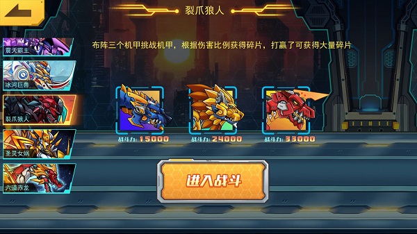 接下来回到主页,打开“每日副本”界面,在众多机甲里找到「烈爪狼王」,接着选择三个你已经拥有的机甲上阵参与战斗,系统会根据机甲造成的伤害比例结算,战斗胜利后就能获取对应的碎片奖励。