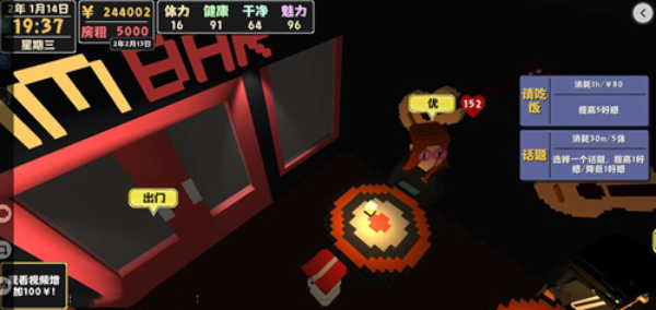第四种方法是,点击游戏页面里的“出门”选项,在地点中选择酒吧,这样就能前往酒吧兼职了,每次打工能挣到180元。