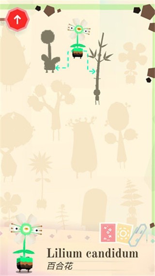 2、按住百合花顶部的红色拉环往下拉,就能看到植物演化公式。比如在下图里,百合花能演化成左右两边的两种植物,至于具体如何让它发生变化,这就需要我们去探索和尝试了。点击左上角的红色箭头,即可收回植物演化表。