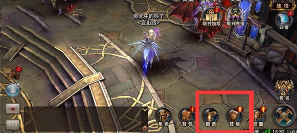 屏幕右下角的功能菜单包含锻造和技能两个选项。锻造菜单用于提升角色的外在装备,技能菜单则是对角色当前使用的技能进行升级,需要注意的是,技能的等级不能超过角色自身的等级。例如,若图片中的角色等级为30级,那么其技能等级最高也只能达到30级。