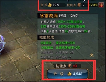 点击技能菜单后,消耗金币与技能点来提升技能等级。技能等级越高,所需的技能点和金币就越多。当技能点不足时,可使用钻石购买,不过每天的购买次数存在限制。