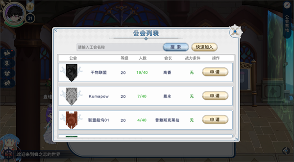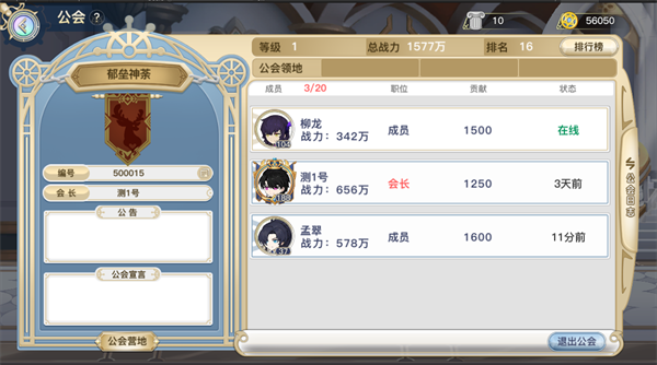 游戏内主角加入或创建公会后,点击主角的人物立绘,会开启公会管理界面,在该界面中,可查看其他公会成员的详细信息,并进行人员管理操作。