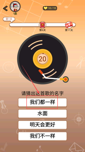 3、开始猜歌环节:根据播放的旋律,从“我们都一样”等选项里挑选出正确的歌名。