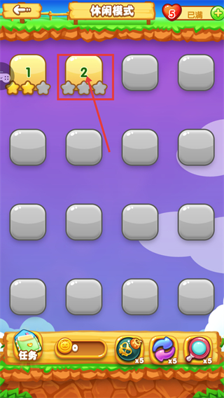 1、在【休闲模式】界面选择【2】号关卡开始挑战,按照关卡顺序依次推进能逐步熟悉消除规则。