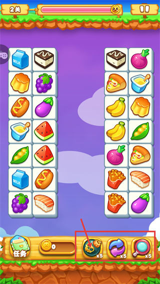 3、优先匹配相同的【热狗】【豌豆】这类物品,借助连线消除来积累进度,要留意物品的分布区域。