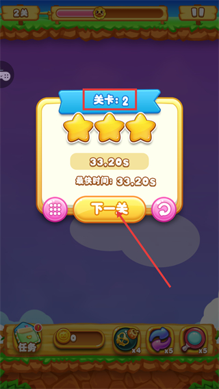 4、完成关卡后可获得【三星】评价与【33.20s】的最快通关时间记录,点击【下一关】继续挑战,进一步提升消除效率。