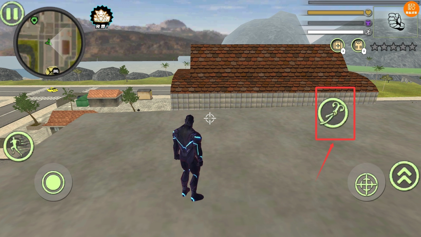 界面右侧的红色箭头指示着特殊互动区域,点击该区域会伸出机械爪,长按可以瞄准目标位置,松开后就能抓取并飞行,这是跨越障碍的关键技能。