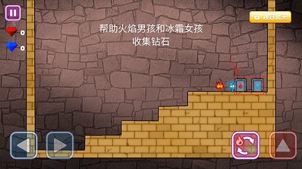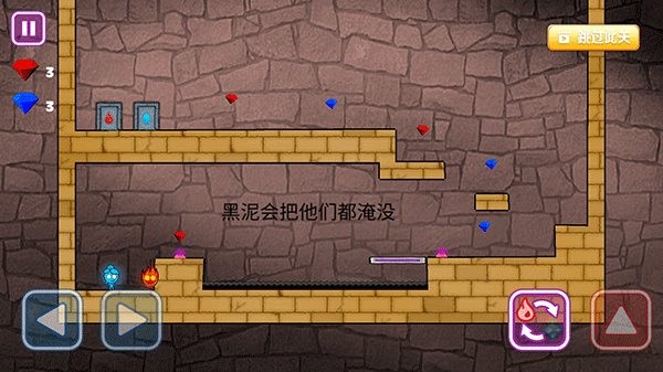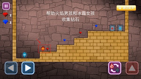 在游戏里,玩家得操控冰与火这两个角色来通关,通过左右按键控制角色移动,右侧的按键则用于切换角色和让角色跳跃。
